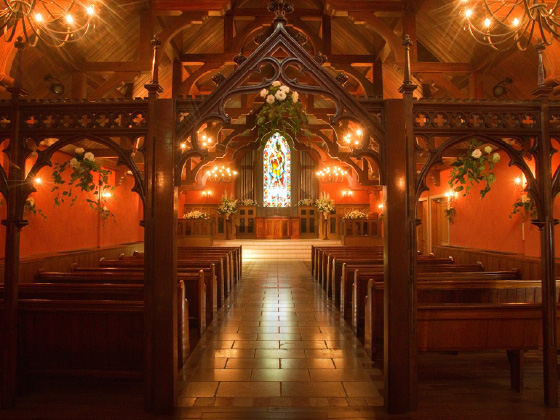 - 気品ある温かな教会で永遠の約束をヨーロッパから取り寄せたアンティークの逸品が気の温もりを感じさせ、誓いの場にふさわしい幻想的な雰囲気です